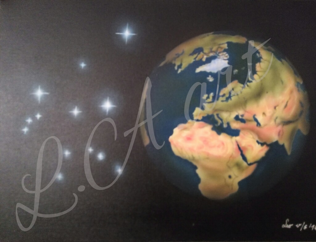 Exploding earth Symboliseert de onrusten over de ganse wereld, een mix van airbrush en olieverf, 150x100 Te Koop/Huur - For Sale/Rent Contacteer mij indien interesse |