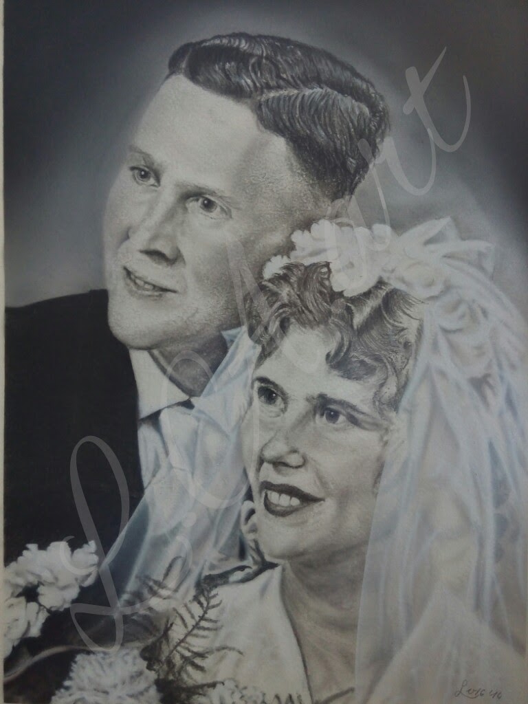 Huwelijks portret Joop en Gré potlood portret, naar voorbeeld van oude huwelijks foto |